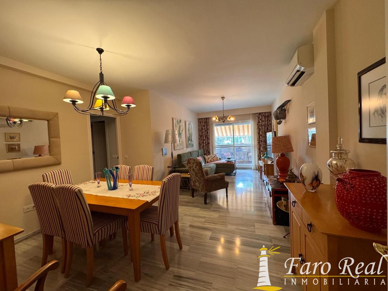 - Salón comedor con aire acondicionado y acceso a una terraza de unos 5 m² equipada con toldo.